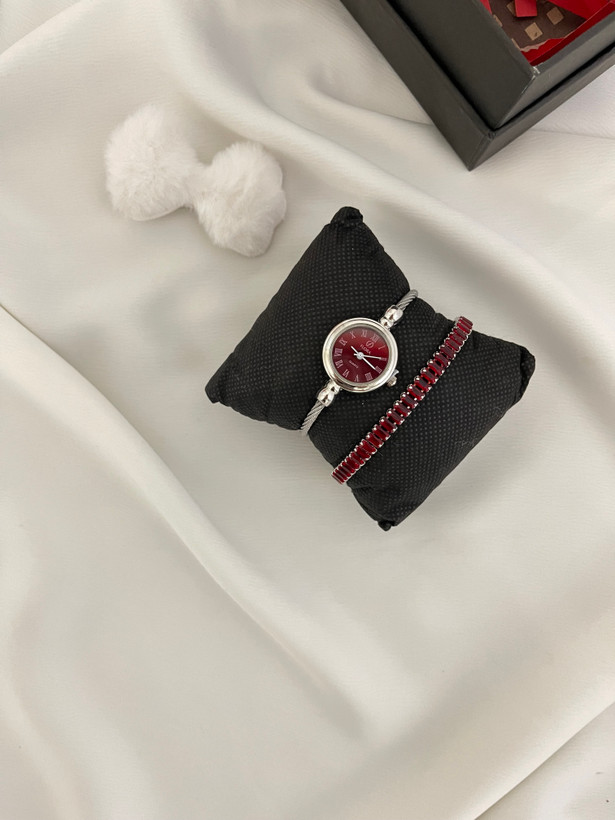 پک شامل ( ساعت بنگلی نقر ه ای با صفحه چری - دستبند تنیسی چری - گلسر پاپیون -
